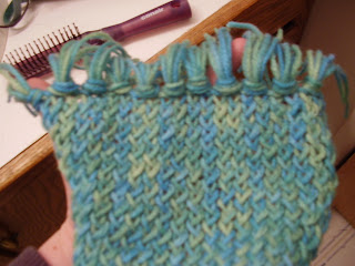 I made the scarf on the small round knitting loom (I bought the set of round looms from Hobby Lobby, they were 50% off) I don't really like the fact that it curls up, but that is probably because I only used one strand of yarn and not two (DUH!) oh well! I didn't want the scarf to be to heavy or thick.
